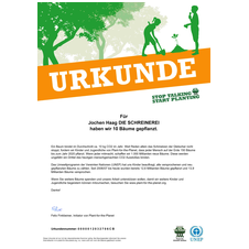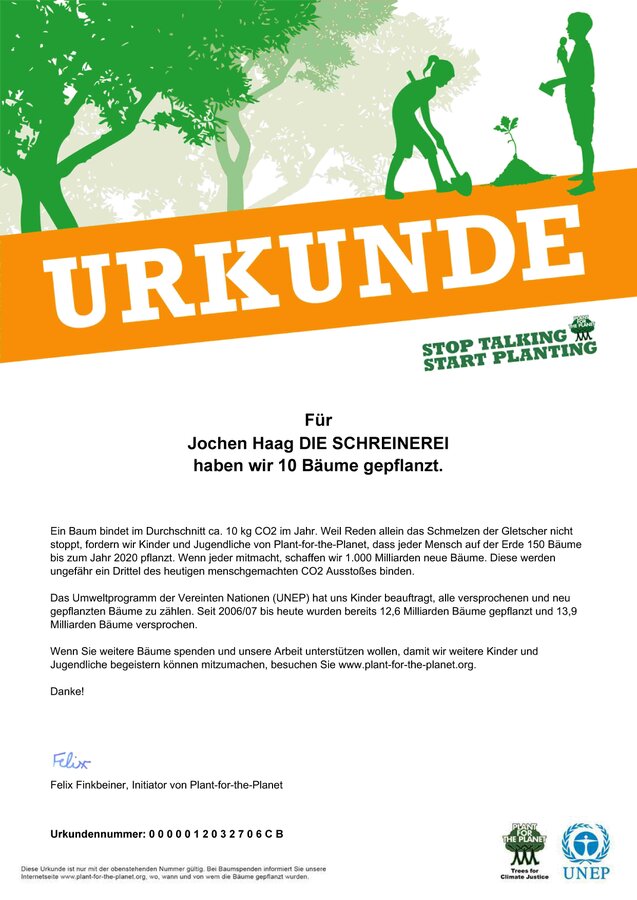 daher stehen wir für die Nachhaltigkeit unsere Hauptrohstoffes und unterstützen hier auch Plant-for-the-Planet mit einer Baumpflanzaktion.